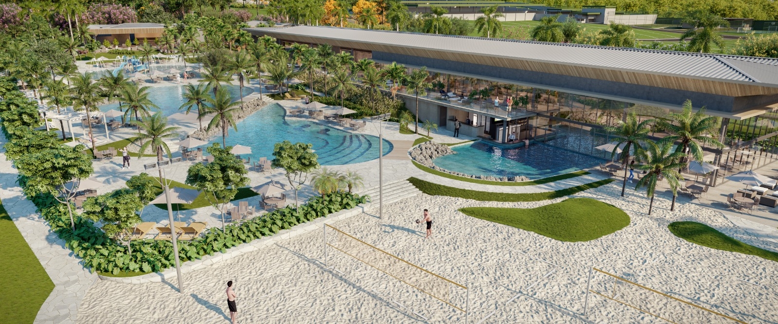 O paisagismo do Vila Noah foi projetado para revitalizar a vegetação nativa, criando uma paisagem contemporânea e exuberante. O amplo bosque central não só abraça as área de lazer, mas também conecta harmoniosamente as residências à praia. À beira do lago, lounges na areia cercados por coqueiros e folhagens tropicais consolidam a identidade inovadora do Vila Noah. Cada elemento do paisagismo foi planejado com precisão, resultando em um oásis visual onde natureza e design contemporâneo se entrelaçam, tornado o Vila Noah um local de beleza e sofisticação.